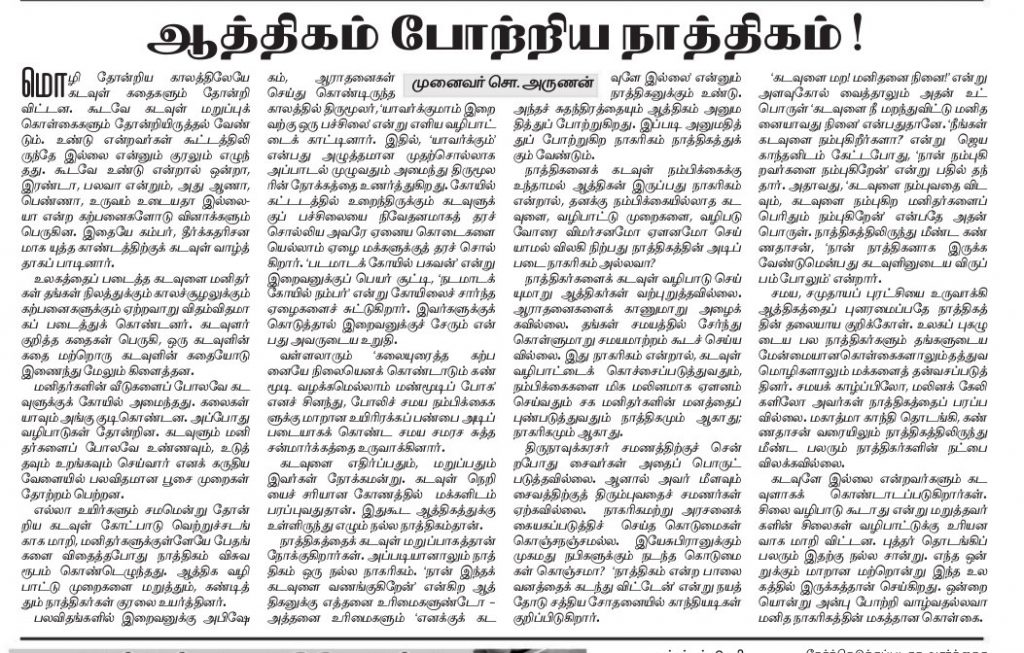 ஆத்திகம் போற்றிய நாத்திகம்? 45 views January 28, 2020 annakannan தினமணி, சென்னை, 28.01.2020 ஆத்திகத்தை நாத்திகம் போற்றியதா? நாத்திகத்தை ஆத்திகம் போற்றியதா? Author annakannan View all posts